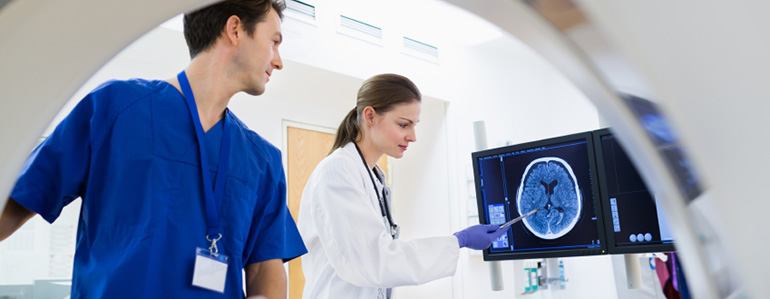 Doctor radiologist observing patient undergoing MRI, CT or PET scan