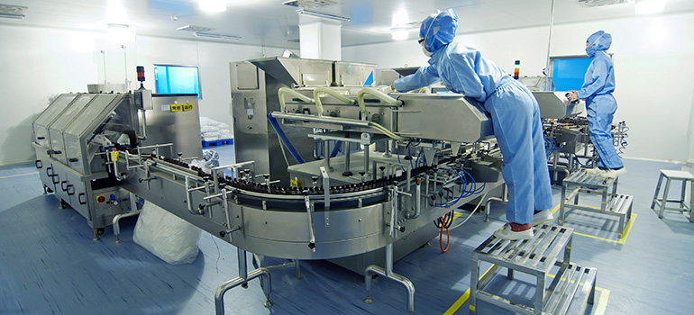 Workers in protective suits operate pharmaceutical production machinery in a bright, sterile laboratory setting.